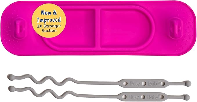 BUSY BABY Silicone Mini Mat - New and Improved Suction Cups, 2 Straps to Secure Baby Essentials, Self Feeding, Baby Led Weaning, Travel Wet Bag Included (Pink Mini)