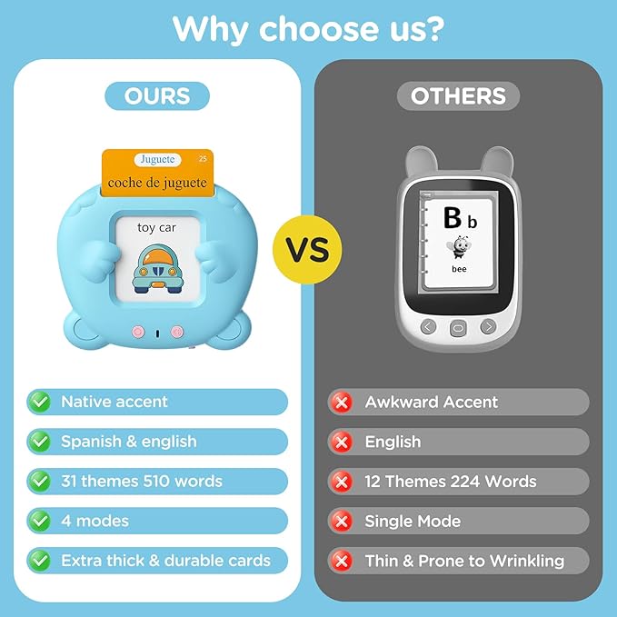 - Autism Speech Sensory Toys: Talking flash card are bilingual in Spanish and English. Flashcards combine colorful images and audio sound, attracting autistic kids to recognize and interact with new things. Improve their language and communication abilities