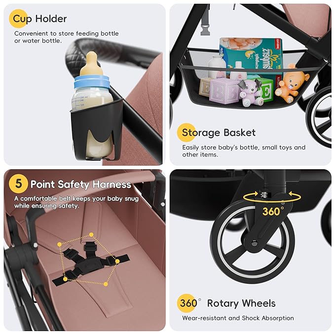 - Safety & Comfort: Crafted with a high-quality aluminum frame, our stroller ensures stability and durability for long-term use. The five-point safety harness adds an extra layer of security. The upgraded shock-absorbing wheels provide 360-degree maneuverability. The UPF 50+ canopy protects your babies from UV rays, ensuring a comfortable outdoor travel experience.
