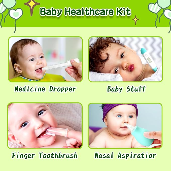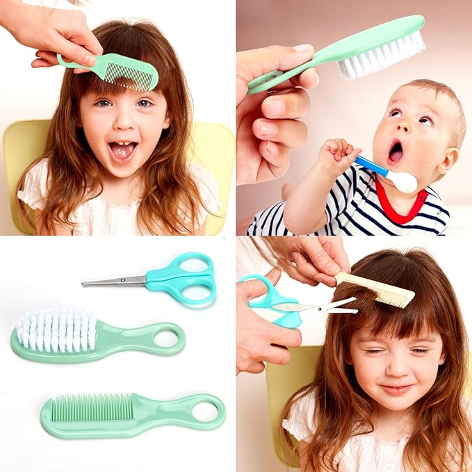 - 【DESIGNED FOR BABY】Each of the baby care set's accessories is designed specifically for babies. Soft silicone brushes, round head design combs and bristle combs, baby hair care and bath set, gentle and non-invasive; medicated feeding spoon and dropper with scale, more accurate and convenient to feed baby; nose cleaner and baby tweezers, small and flexible tips, more comfortable for baby.
