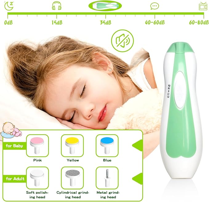 - 【ELECTRIC BABY NAIL CLIPPER SET】The newborn grooming set comes with 1 electric nail trimmer and 6 trimmer attachments (5 sanding heads and 1 metal nail file). The grinding head allows nail repair for babies of all ages without damaging the delicate epidermis or nail bed, safely and quickly trims and polishes little toenails and fingernails, and with a whisper-quiet design aimed at fingernails, you can trim without waking your sleeping baby.