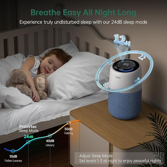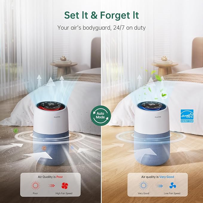 - Smart Auto-Mode & Real-Time Air Sensing:Provirtec air purifier's ultra-sensitive sensor detects pollutants within seconds, instantly boosting fan speed to purify and refresh indoor air; Provirtec original filter is HEPA-grade while operating in auto mode, as tested by an independent lab