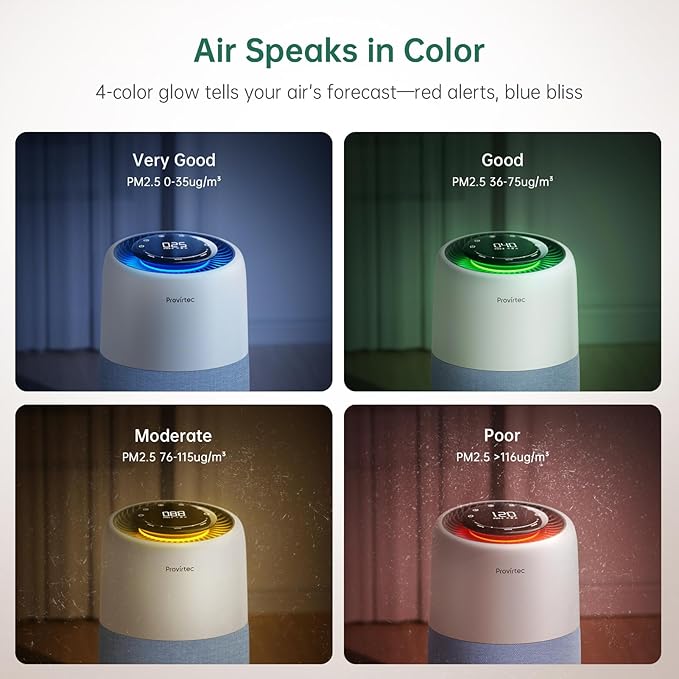 - Air Quality Visualizer & PM2.5 Air Quality Monitor: HEPA air purifier with 4-color air quality indicator lights, HD display show real-time PM2.5 levels, instantly reflect indoor air conditions