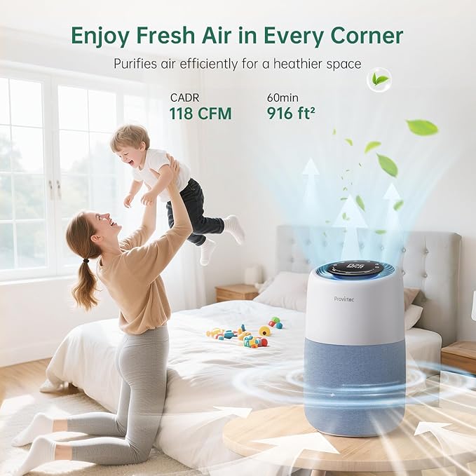 - Air Purifier Delivers Rapid Whole-Room Purification in 12 Minutes: 118 CFM CADR purifies 916 sq. ft. spaces hourly or 183 sq. ft. bedrooms every 12 minutes, significantly improving indoor air quality and helping you and your family enjoy fresher air