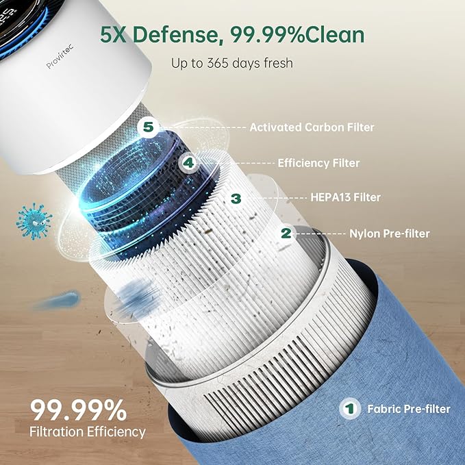 - 5-Stage Filtration System & 365-Day Filter Life: Advanced 5-layer filtration including 2-layer pre-filter, True HEPA13, efficiency filter and activated carbon; The air purifier captures 99.99% airborne particles with a size of 0.3 microns