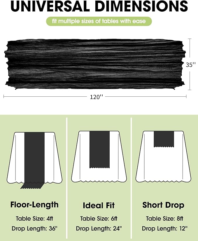 - UNIVERSAL DIMENSIONS: Measuring 35"Γ120", this cheesecloth table runner is ideally sized to fit standard 6-8ft tables, offering suitable coverage with just the right amount of drape. The 12" to 24" drop on both ends adds a graceful touch that enhances the overall presentation of your table.