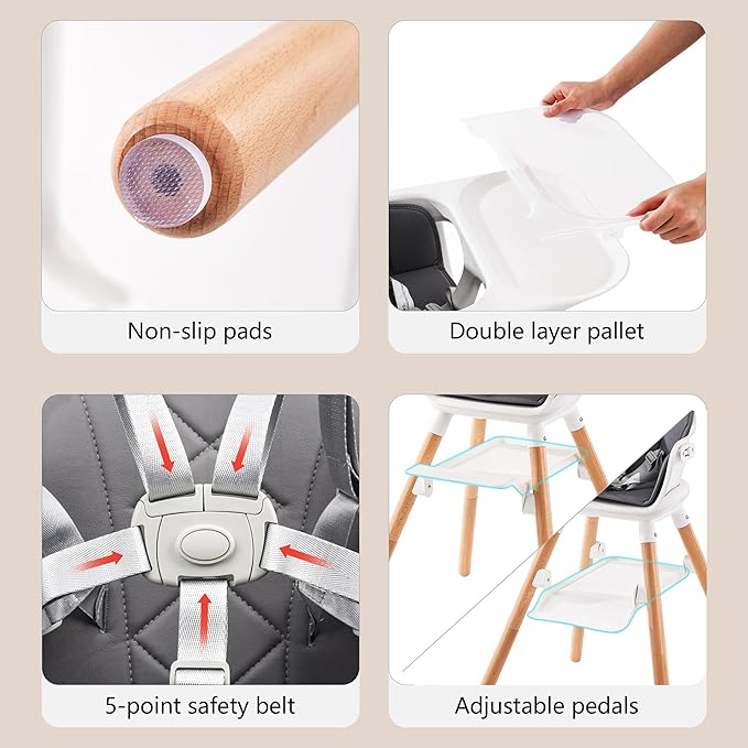 - Eco-Friendly & Safe Material: our baby high chairs are made of food-grade PP and PE to ensure that your baby's health is not affected. The baby highchair's legs are made of thick beech wood with non-slip feet.