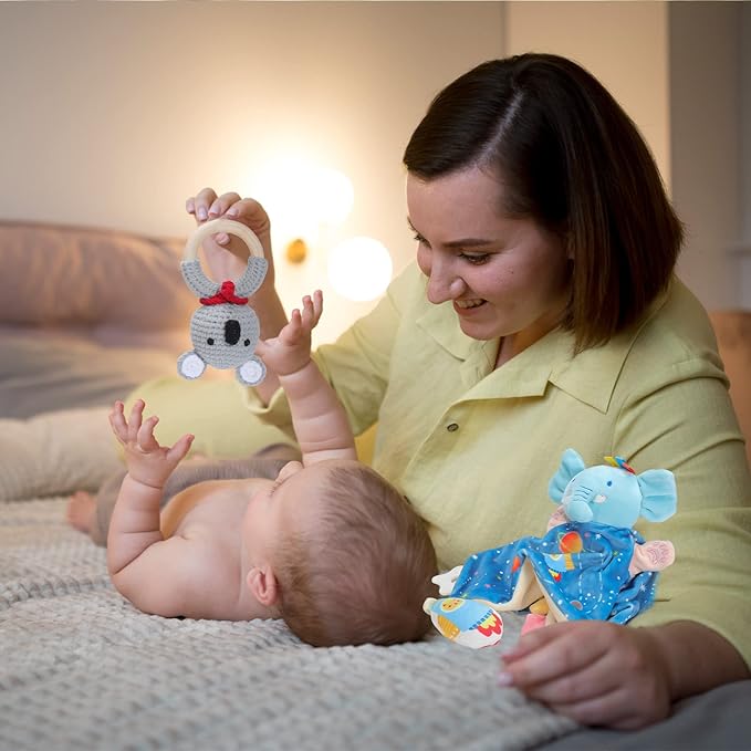 - Enteraining Security Blanket & Rattle -The Koala rattle and elephant blanket are exquisite toys that provide entertainment and stimulate a baby's auditory and visual senses. The rattle can help the baby learn to grasp and shake, enhancing hand-eye coordination. These are fun interactive tools that parents and babies can play with together.
