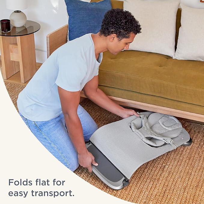 - CONVENIENCE: The clip-in adjustable harness makes it simple to place baby in or take them out. At 8.4 lbs or 3.8 kg, this baby bouncer seat is easy to move and folds flat for use in different rooms. Baby rocks naturally with no need for plugs or switches. Clean design fits in with any room in the home.