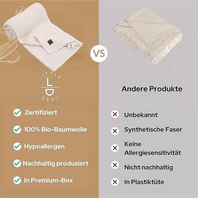 - Special Feature : [GOTS-CERTIFIED ORGANIC COTTON]: Crafted from 100% organic cotton, ensuring hypoallergenic and chemical-free comfort for delicate baby skin, setting it apart from conventional blankets., [MADE IN TÜRKİYE AT A SUSTAINABLE FACTORY]: Produced in a next-generation, eco-friendly factory that combines traditional craftsmanship with innovative sustainability practices, ensuring ethical and high-quality production., [PREMIUM VEGAN LEATHER TAG]: Includes a sophisticated vegan leather tag, blending sustainability with a modern, luxurious touch rarely seen in baby blankets., [REUSABLE GIFT BOX PACKAGING]: Packaged in a durable and elegant gift box, ideal for gifting and reusability, offering eco-conscious value beyond the blanket itself., [TIMELESS PREWASHED KNIT DESIGN]: Featuring a classic knit pattern that combines elegance with durability, making it a standout choice for style-conscious parents. [GOTS-CERTIFIED ORGANIC COTTON]: Crafted from 100% organic cotton, ensuring hypoallergenic and chemical-free comfort for delicate baby skin, setting it apart from conv… See more