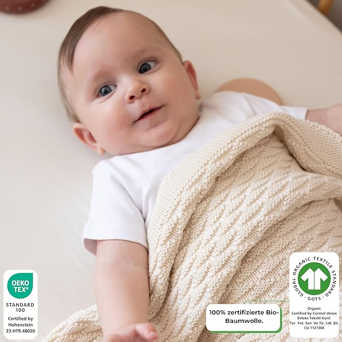 - [100% ORGANIC COTTON BABY BLANKET]: Made from GOTS-certified organic cotton, this breathable, hypoallergenic blanket ensures your baby’s delicate skin is safe. Designed with a timeless knit pattern, it’s soft, lightweight, and perfect for newborns and toddlers. Use it as a swaddle, crib blanket, stroller cover, or for tummy time. Highly praised by parents for its durability, this blanket retains its softness after multiple washes. Ideal for sensitive skin and eco-conscious families.