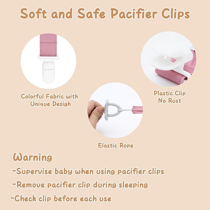 - Safety-Pacifier clips with plastic teeth hold tight and will hardly damage baby's clothes or discomfort the baby,but please do not let your baby chew on the clips to avoid a choking hazard.They are BPA free,phthalate free,latex free,lead free and CPSIA certified,pacifier clip holder are washable,durable and soft.