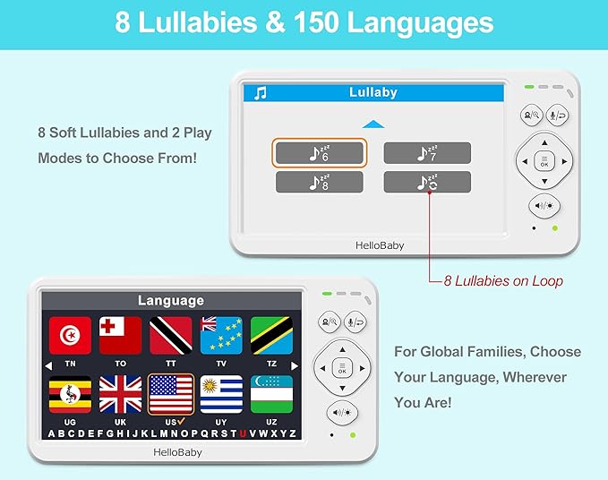 - 6-【Smart Baby Monitors AND 1 Year Coverage】: You don't need to go to the menu page, you can adjust the volume and brightness directly on the buttons in one step, which is convenient and fast. It has a variety of functions, including Multi-camera expansion (Maximum 4), 150 language options, Audio power saving mode (ECO Mode), Room temperature monitoring with alerts, Night vision, Feeding reminders, Sound level LED indicator, Tabletop or Wall mounting options, Remote Pan-Tilt-Zoom, and 8 lullabies to soothe baby. Speaker on the baby unit is on the back, avoids loud noises frightening infant, while they can enjoy soft lullabies