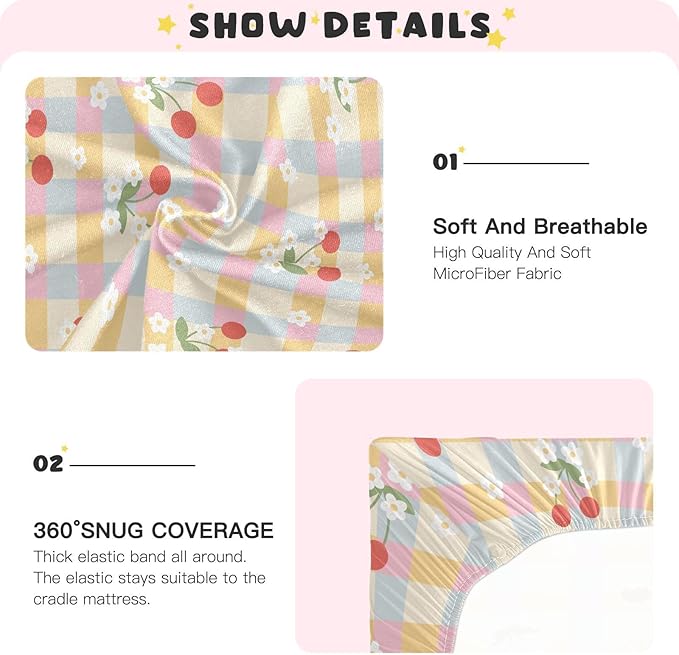 Baby Crib Sheets Gingham Flowers Crib Sheets for Boys Girls,Neutral Bassinet Toddler Bed Play Sheets Breathable Soft and Portable 52 * 28 * 9in