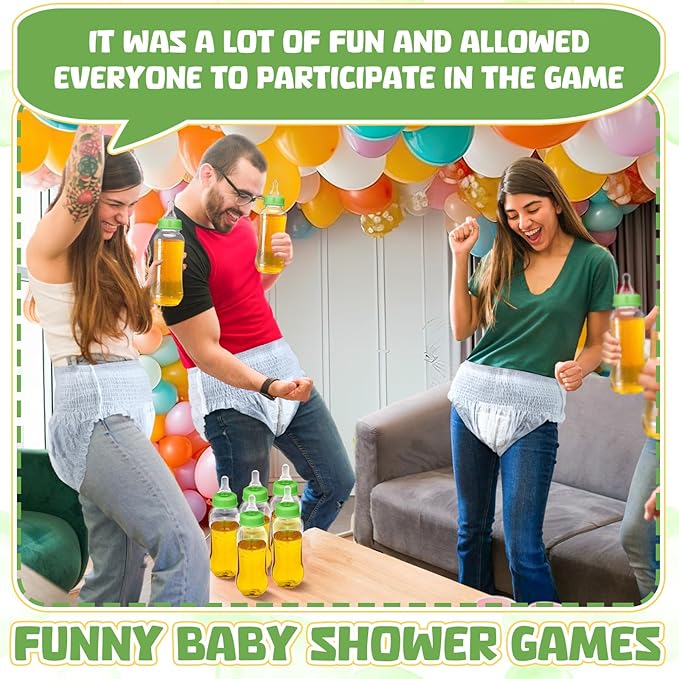 - Complete Baby Shower Game Supplies: this bottle chug baby shower games package includes 12 pcs baby bottles for baby shower games and 12 adult size diapers, which are large enough for adults without worrying about getting stuck and affecting the game experience; This complete baby shower play set brings the joy and excitement of a baby shower to life, giving everyone the opportunity to participate and enjoy