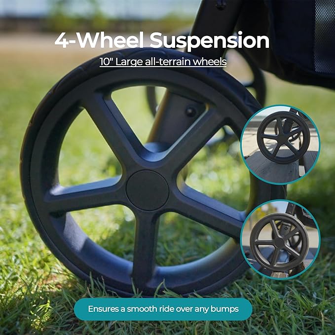 - Smooth All-Terrain Ride with All-wheel Suspension - Engineered with large, 10-inch all-terrain wheels and an advanced 4-wheel suspension system, this newborn stroller effortlessly and absorbs every bump in its path. From cobblestone streets to park trails, it ensures a consistently smooth and serene ride, protecting your sleeping baby from any disturbance.The rear-linked foot brake secures the stroller with a simple tap.