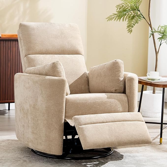 Swivel Rocker Recliner Chair,Manual Nursery Swivel Rocking Recliner,Upholstered Adult Rocking Glider Chair with 2 Pillows for Living Room Bedroom (Khaki, Manual Operation)