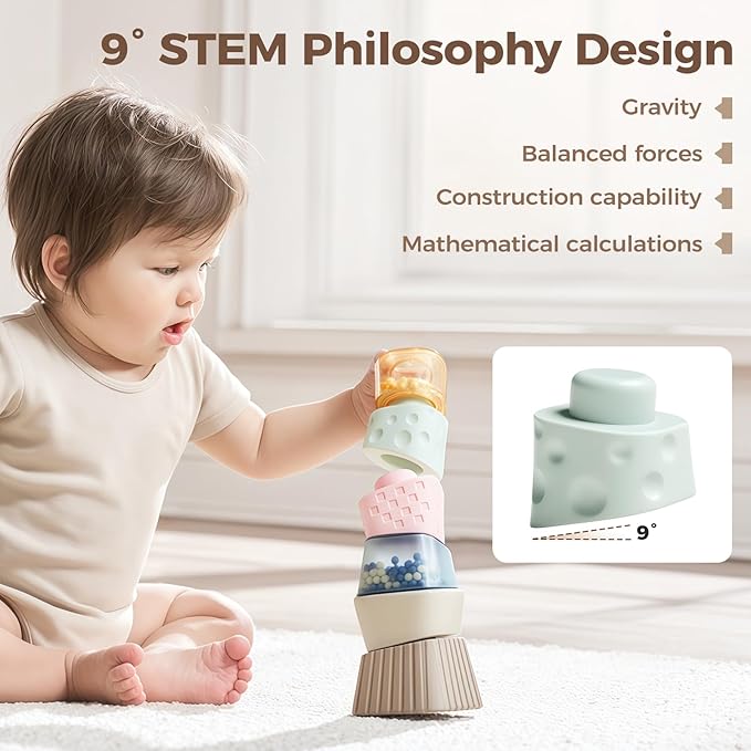 - 【Evoceler STEM Baby Toys】: This set features 9°incline angled stacking blocks that teach engineering concepts like balance and symmetry. Vibrant geometric shapes enhance spatial reasoning, while BPA-free, child-safe materials support growth from color matching to STEM building