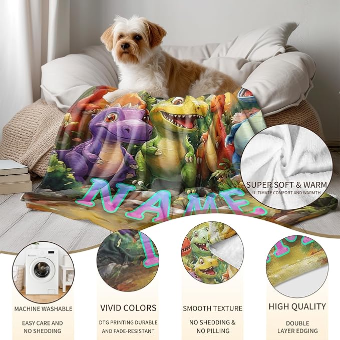 Ship Next Day, Custom Dinosaur Blanket - Printed in USA, Personalized Blankets with Name, Gift for Kids Boys Girls, Unique Present for Birthday, Christmas, Educational Blankets for Children