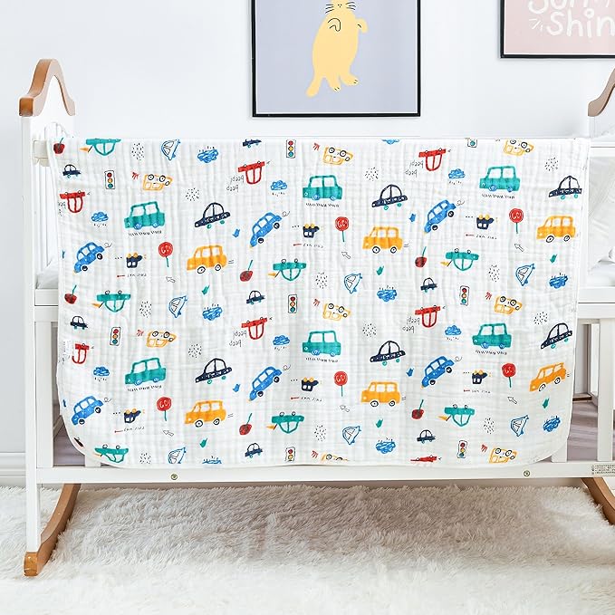 - Seasons-Proof Comfort Genius: Unlike thin summer blankets that lack coziness or heavy quilts causing overheating, our 6-layer cotton muslin is nature's thermostat. Breathable holes circulate air in heatwaves (perfect for tummy time!), while dense weave traps warmth when temperatures plunge. The ultimate lightweight toddler blanket for daycare, travel blanket for road trips, or cooling stroller cover – 365 days of perfect sleep