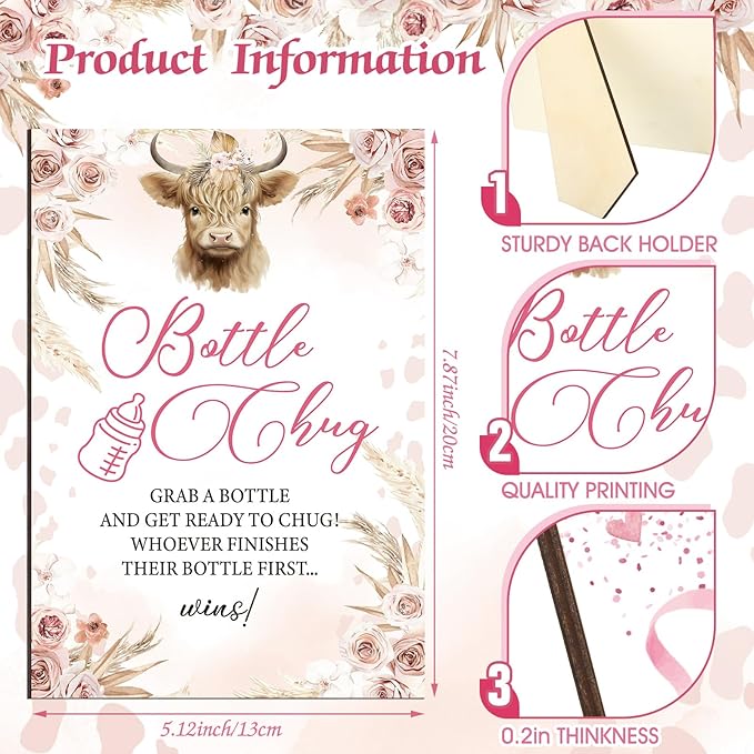 - Memorable Baby Shower Game: highland cow baby shower games make your baby shower unforgettable with the party favors, both the sign and bottles have an exquisite design that adds a charming touch to your party; The game is easy to play and ideal for creating a joyful atmosphere during the celebration