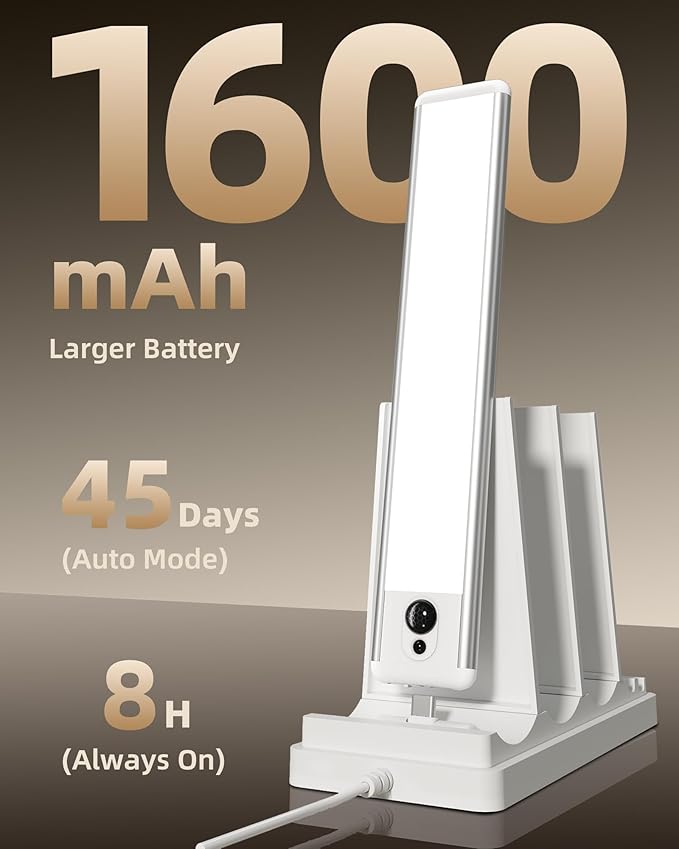 - Rechargeable Battery & Smart Charging Base: Each light includes a 1600mAh rechargeable battery that lasts up to 45 days in Auto Mode or 8 hours in Always-On. The 3-slot USB-C dock charges multiple rechargeable lights at once without clutter, and can also power phones or headphones—great for keeping your kitchen organized and devices ready