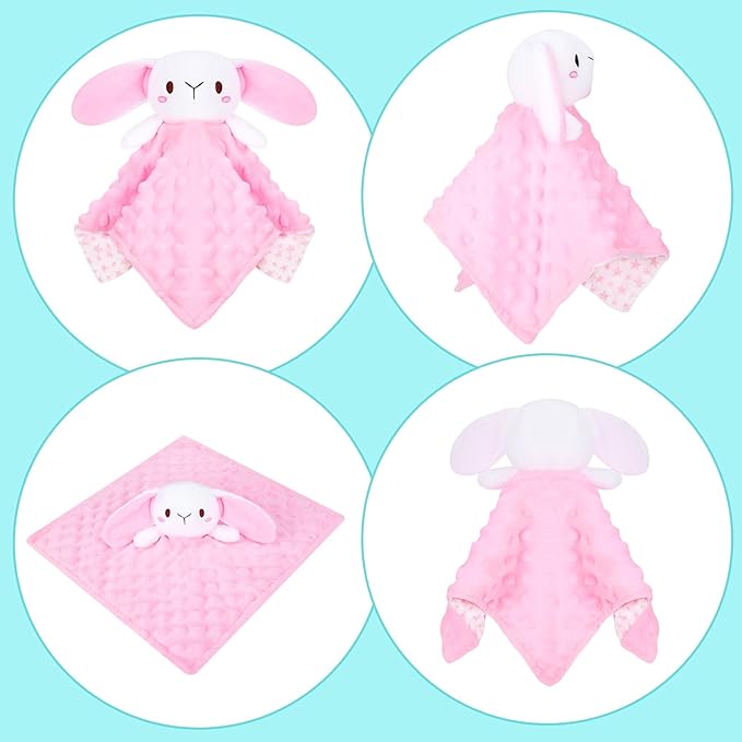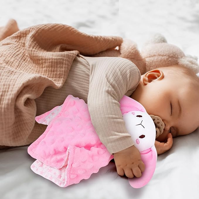 - 【Lovey Blanket Comfortable Fabric 】 Bunny plush animals are made of soft and safe polyester fiber material. The soft dot like plush fabric brings more touch to babies, enhances their sense of security, and is a comfortable toy that can be hugged and touched. It is safe for babies, climate friendly, and has no shedding or pilling; Sleep is crucial for the growth and development of infants. No matter where they are, in a crib, stroller, or car seat, comfortable rabbit comfort pads can help babies fall asleep quickly or feel safe.