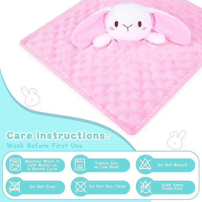 - 【 Precautions for Bunny Blankets 】 Security Blankets need to be cleaned before first use. They can be gently machine washed or hand washed with cold water, and then dried in a low-temperature dryer or placed in the sun to dry; Remember: Do not bleach, do not iron, do not dry clean, and keep away from sources of fire.