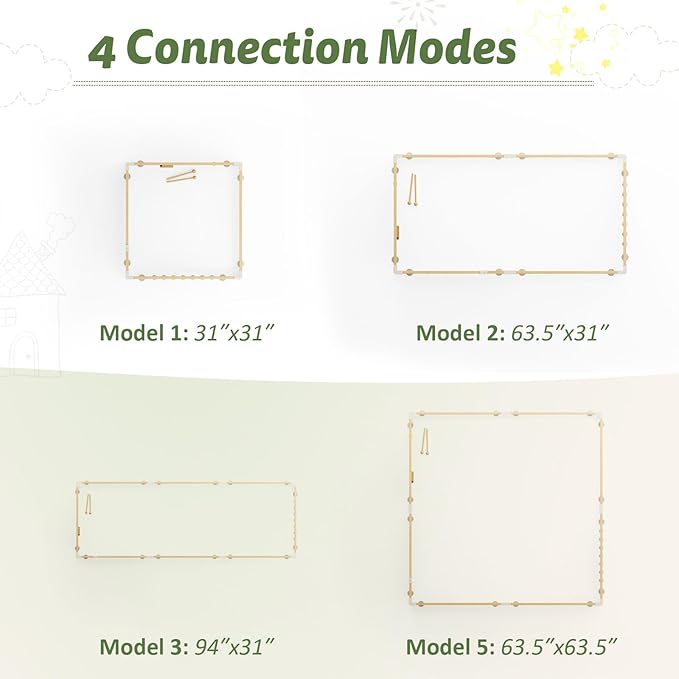 - Flexible Shape: This baby play yard keeps your little one entertained while promoting exploration and development. With 8 panels, you can easily customize the enclosure into 4 different sizes and shapes to fit any space, ranging from a cozy 31x31 inches to a spacious 63.5x63.5 inches.
