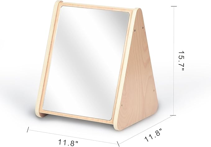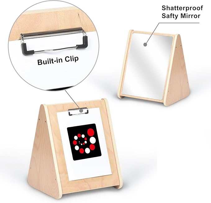 - Double-Sided: This dual-sided toy mirror boasts a stable triangular shape with rounded corners. One side features a safety mirror, while the other has a clip for visual cards. This compact Montessori furniture enhances the charm of baby's rooms, tots playroom, education centers, classrooms, and daycare settings.