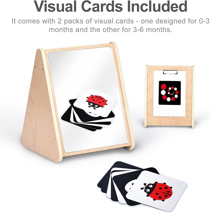Baby Double-Sided Tummy Time Mirror w/ 2 Package High Contrast Visual Stimulation Cards, Sensory Activity Montessori Toys for 0-18+ Months Boys Girls