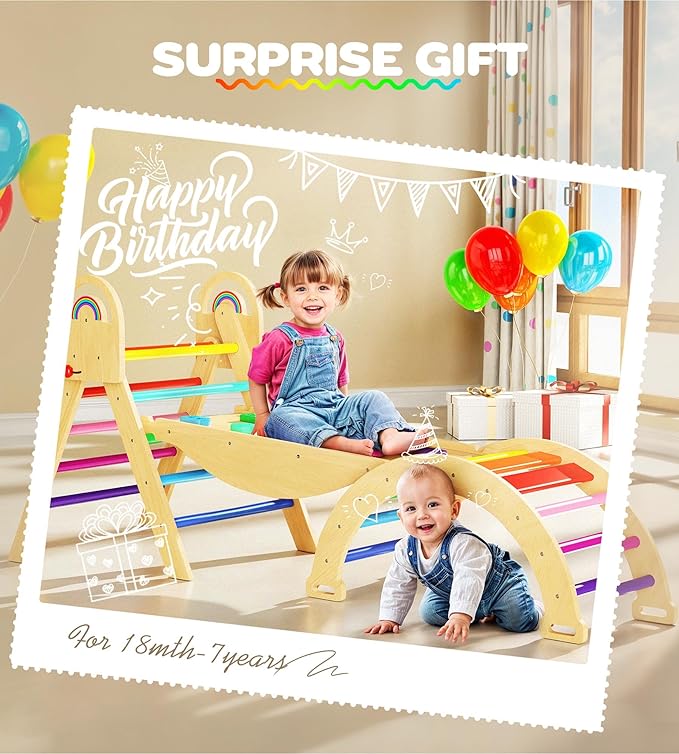 - 9-in-1 Fun & Activity Center: Tired of toys your child ignores after five minutes? Our rainbow pikler triangle set features a triangle ladder, slide, and arch—offering unlimited fun. Whether solo or with friends, your child stays active and entertained all day