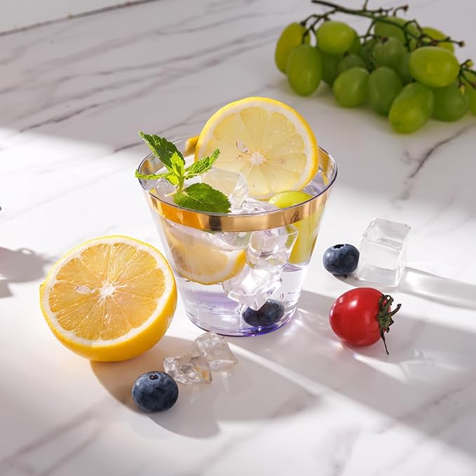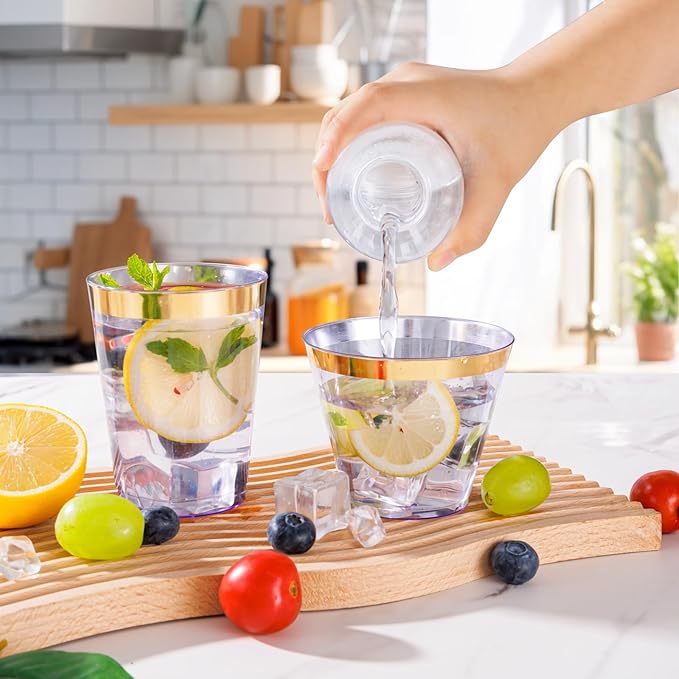 - Elegant Clear Purple Cups: Add a touch of elegance to every sip with our purple plastic cups! These plastic cups boast a striking clear purple color paired with a luxurious gold rim, perfect for your dining table or any themed party. The disposable plastic cups are lightweight yet sturdy build ensures a comfortable grip, making every sip feel special.
