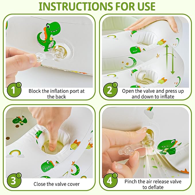 - Easy to Use, and Portable: The inflatable baby seat can be easily inflated within 3 minutes by pressing the built-in air pump up and down. Due to the leak-proof design, it is necessary to pinch the air valve when deflating. After deflating, fold it back to a small size for putting away, which is perfect for trips to the beach, camping or park.
