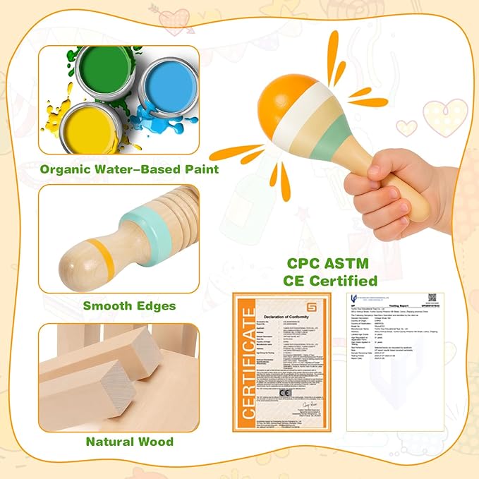 - ๐ฑ Child-Safe Montessori Toys for Toddlers 1-3- Our baby musical instruments are made from natural wood & non-toxic water-based paints. The montessori instruments for toddlers are CPC/ASTM certified. The montessori baby toys come with Smooth edges, no splinters, and baby-safe construction ensure worry-free play. Ideal toddler musical instruments for 1 2 3 Year Old, BPA-free and easy to clean.