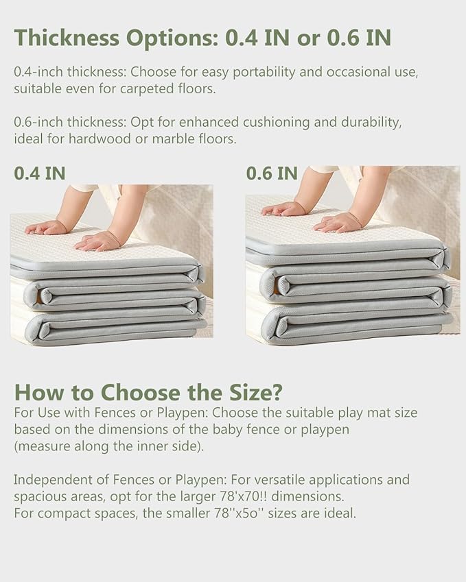- [Multi-specification & Large Size]: Our baby mat for floor desighed in multiple sizes, 50"*78" & 70"*78" provide enough space for your little one to explore, play, and take a nap. We are the only brand that provides with 0.6" and 0.8" thickness playmats on Amazon, more specifications for you to choose.