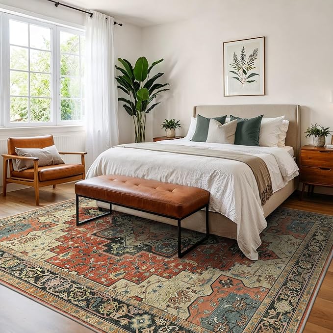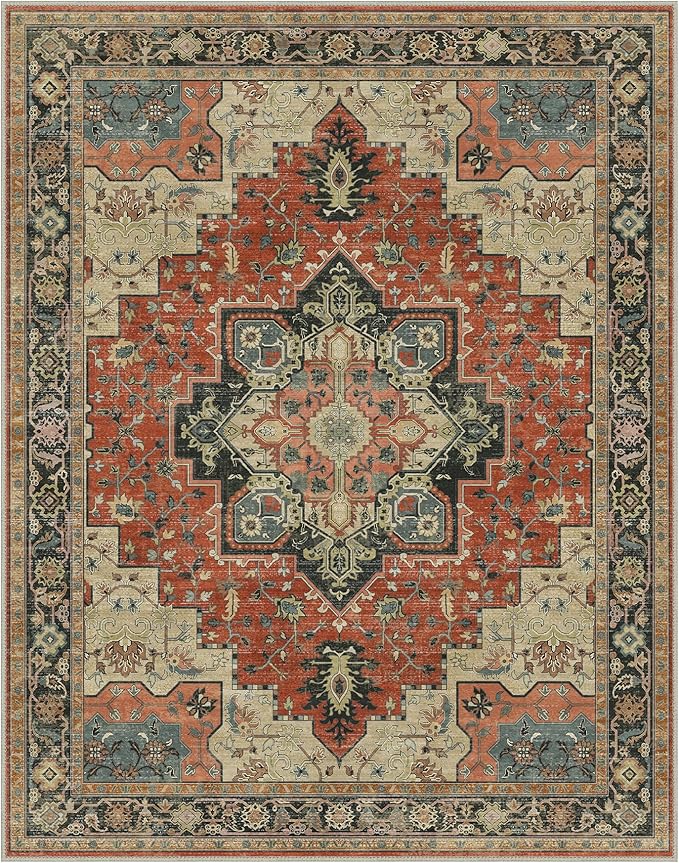 GENIMO 8x10 Area Rugs for Living Room, Machine Washable Non Slip Vintage Rugs, Low Pile Lightweight Chenille Print Rug for Bedroom, Dining Room, Home Office,Desert Ember