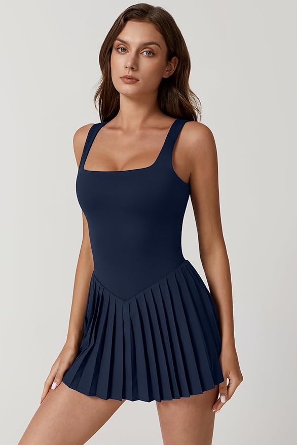 - Fashion-Forward Design: The QINSEN Womens Square Neck Tennis Dress features a stylish square neck, sleeveless design, and a I-shaped back complemented by a playful pleated skirt, making it the perfect blend of fashion and casual wear for active women.