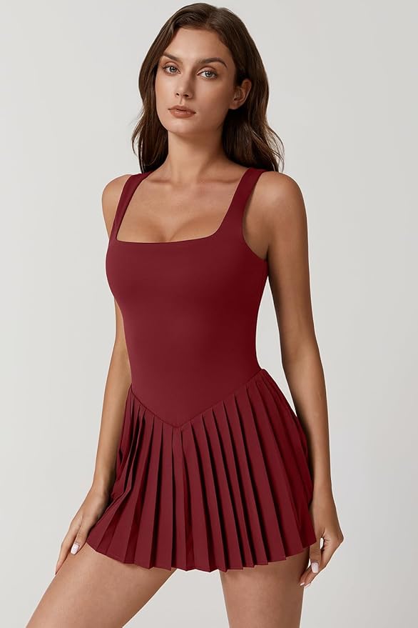 • Fashion-Forward Design: The QINSEN Womens Square Neck Tennis Dress features a stylish square neck, sleeveless design, and a I-shaped back complemented by a playful pleated skirt, making it the perfect blend of fashion and casual wear for active women.