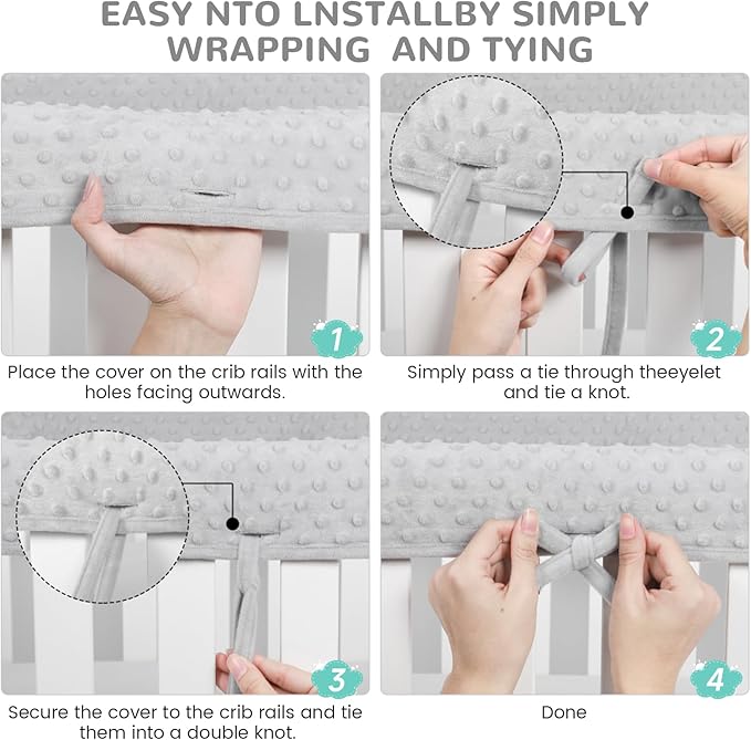 - 【Easy to use】: Easily installed in seconds, our crib railing cover is designed for quick and easy installation, saving valuable time for busy parents. Cover the top guardrail with the free side facing out, then pass a strap through the small hole, fasten the two straps tightly and tie a knot, and the crib rail protector is ready to use!