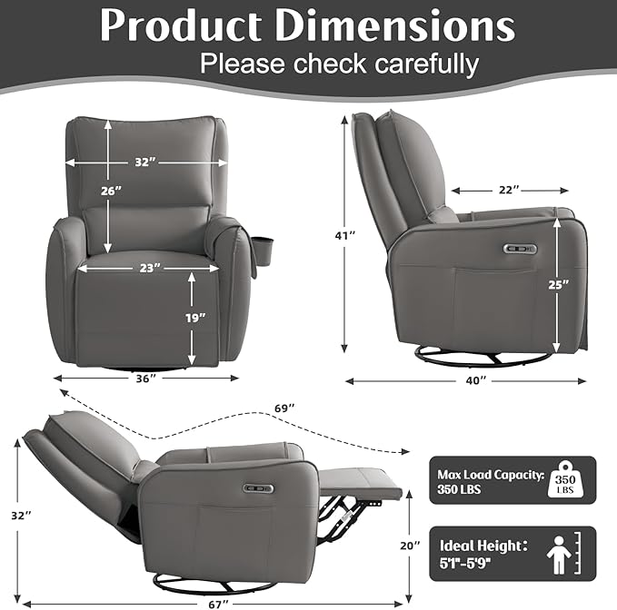 - Compact Size and Easy Assembly: The overall size of our nursery glider recliner is 36"(W) x 40"(D) x 41"(H)inch. You can enjoy the fun of tool-free assembly by our Cfvyne swivel rocker recliner. Assemble this power recliner chair is really a breeze - just slide the backrest and 2 armrest into the chair base and connect the transformer, then you can enjoy this chair happily. We also provide customers with easy-to-understand instructions and assembly video.