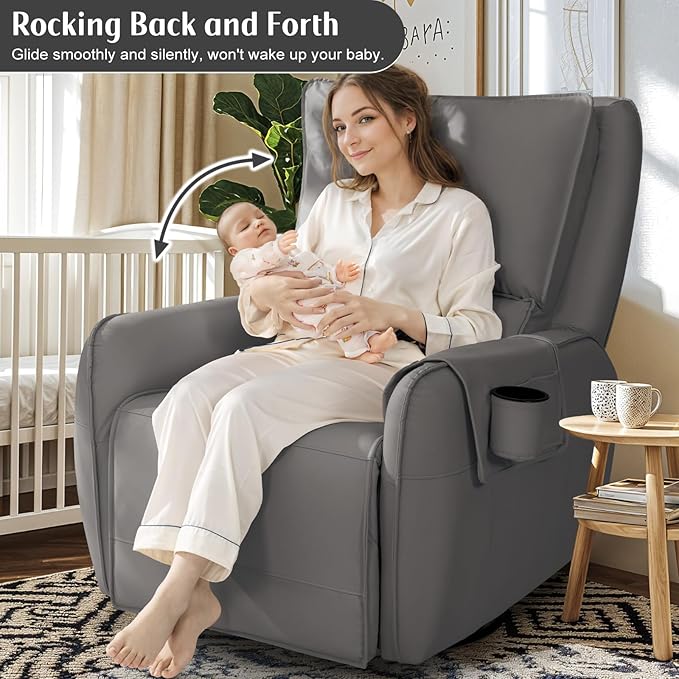 - Silent Rocker Recliner: Our nursery glider recliner is made of high-quality mechanism and frame, so it works quietly and noiselessly, which can make your little one sleep peacefully. Moreover, the glider recliner is made of silicone leather, which is green and no-smell, The quality material is good for your little one.