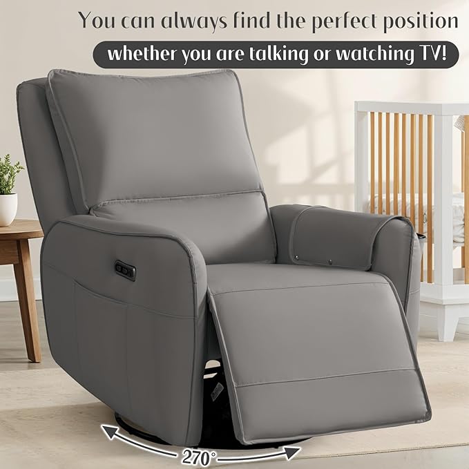 - Power Swivel Glider Recliner: Rocking and reclining are the most desired features of a nursery glider, meanwhile it can also swivel. With our swivel rocker recliner, you can rock your little one gently to sleep, shift your direction to reach for something, or get out of the recliner chair conveniently. You can also press the electric button to make this chair recline to a more comfy position for a sweet nap.