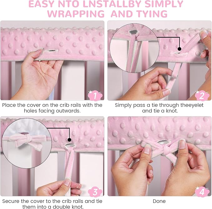- 【Easy to use】: Easily installed in seconds, our crib railing cover is designed for quick and easy installation, saving valuable time for busy parents. Cover the top guardrail with the free side facing out, then pass a strap through the small hole, fasten the two straps tightly and tie a knot, and the crib rail protector is ready to use!