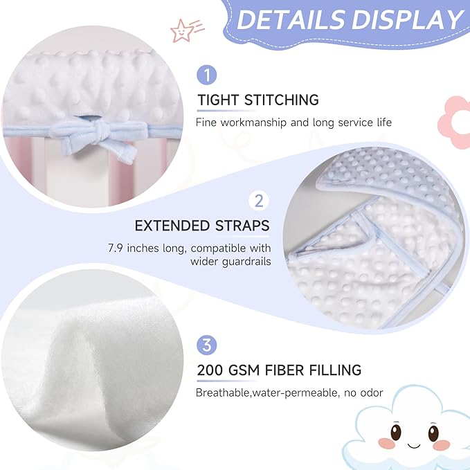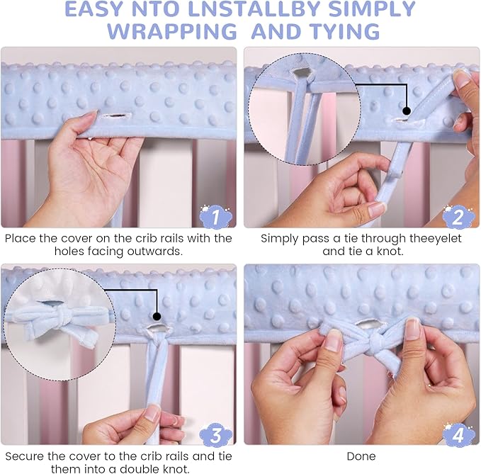 - 【Easy to use】: Easily installed in seconds, our crib railing cover is designed for quick and easy installation, saving valuable time for busy parents. Cover the top guardrail with the free side facing out, then pass a strap through the small hole, fasten the two straps tightly and tie a knot, and the crib rail protector is ready to use!