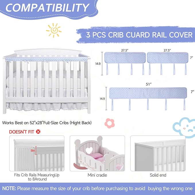 - 【Perfect Size】: Crib top rail covers for teething are composed of three parts, 1 long panel (51 inches x 7 inches) and 2 short panels (27.5 inches x 7 inches). The crib guardrail cover is best placed on a full-size crib of 52 inches x 28 inches, which can perfectly wrap three sides to protect the baby's safety and enhance the appearance of the crib.