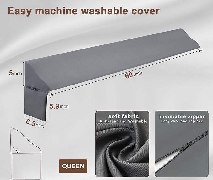 Vekkia Queen Bed Wedge Pillow/Headboard Pillow for Headboard Gap,Bed Gap Filler to Close Gap (0-3.5"),with Handy Pockets and Washable Cover- Grey