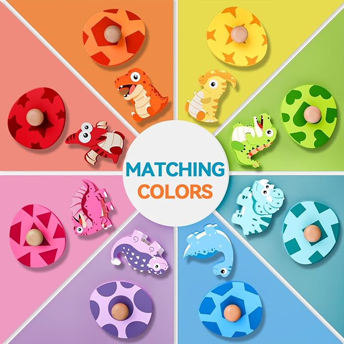 - Color Matching & Fine Motor Skills: The color of the eggs matches the dinosaurs, and toddlers can match the eggs to the dinosaur puzzle pieces. With easy-grasp wooden knobs, babies and toddlers will delight in practicing grasping, lifting, and manipulate the pieces, which enhances their fine motor skills.