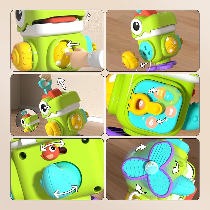 - [Dinosaur Busy Cube Toy] Newcrave designs a cute cartoon dinosaur to encourage babies to have fun. The dinosaur busy toy has 6 different functions, such as the clock, the tongue can be put out when pressing the dinosaur body, spinner toys. Travel toys for babies aged 12-18 months develop concentration and logical thinking skills.
