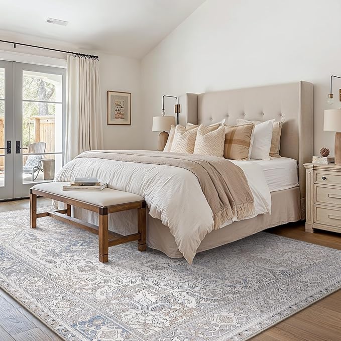GENIMO 5x8 Area Rugs for Living Room, Machine Washable Low Pile Rugs, Chenille Non Alip Vintage Rug for Bedroom, Dining Room, Home Office, Khaki Blue